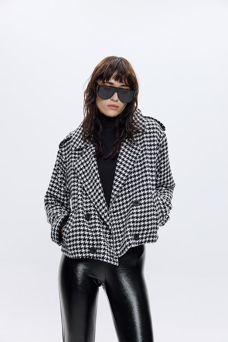 Solena Crop Jacket in classic pied de poule. Fitted cut with clean proportions and refined construction. Minimal design that maximizes styling versatility across your wardrobe.